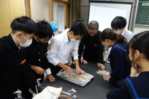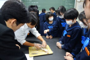 11/21授業の様子 黒部市立明峰中学校 | 2025年11月25日 | コメントはまだありません | 2年 11月21日(金)2年生の理科で「軟体動物(イカ)の解剖と観察」を行いました。これまでの学習と関連付けて、外とう膜、感覚器官(目)、消化器官(胃、肝臓等)、運動器官(あし)などの位置やはたらきを確認しました。 食べたものでパンパンになっている胃や、目の中にある透明なレンズなどを目の当たりにして、驚きの声が多く上がっていました。他の学級も後日実施予定です。お楽しみに! 2年