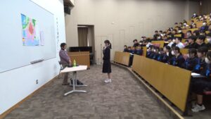 石原さんは、胎内被爆者として、家族からお聞きされた、当時の原爆が落とされたときの様子や被害を受けられた方々のお話を具体的に説明してくださりました。また、生徒には、「両親にもらった命に感謝して、元気に生きていって欲しい。そして、元気に大人になり、戦争は無意味だということを自分の子供に教えてあげて欲しい。」と語られ